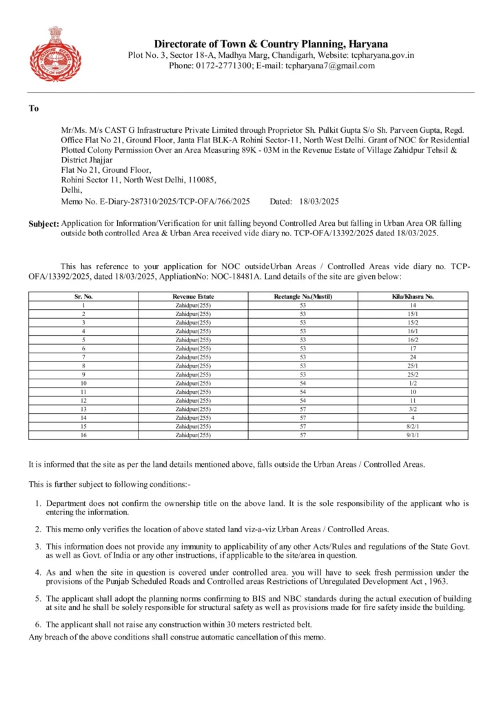 Spread across 12 acres, the project is officially approved under NOC No: TCP-OFA/13392/2025, issued by the Department of Town & Country Planning, Panchkula, Haryana.